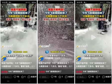 大陆社交平台上有很多北京人拍摄的街头漫天白絮的视频,飘扬的白絮不但密集度大,而且体积大。这不是北京某个特定的地点情况,而是北京城区居民生活中的常态。