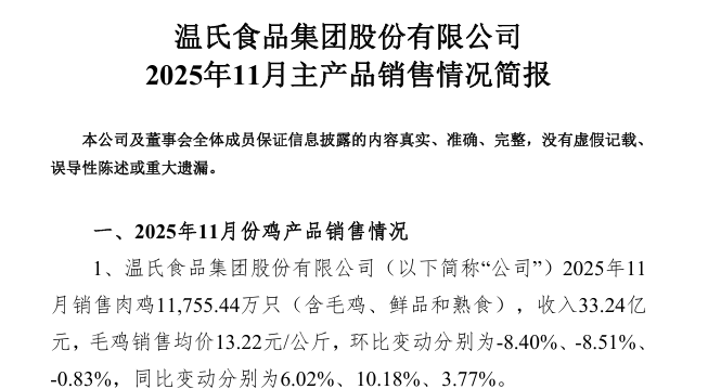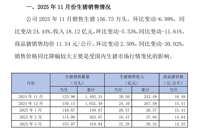首先发布数据的是温氏股份,其在12月5日的《2025年11月主产品销售情况简报》中表示,温氏股份生猪销售收入51.99亿元(人民币,下同),环比增长2.99%,同比下降14.19%。