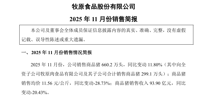 6日,牧原股份和新希望先后发布了《2025 年11 月份销售简报》和《2025 年11 月生猪销售情况简报》。牧原股份表示,商品猪销售收入93.9亿元,环比下降9.1%,同比下降20.43%。新希望生猪销售收入18.12亿元,环比下降5.53%,同比下降11.61%。