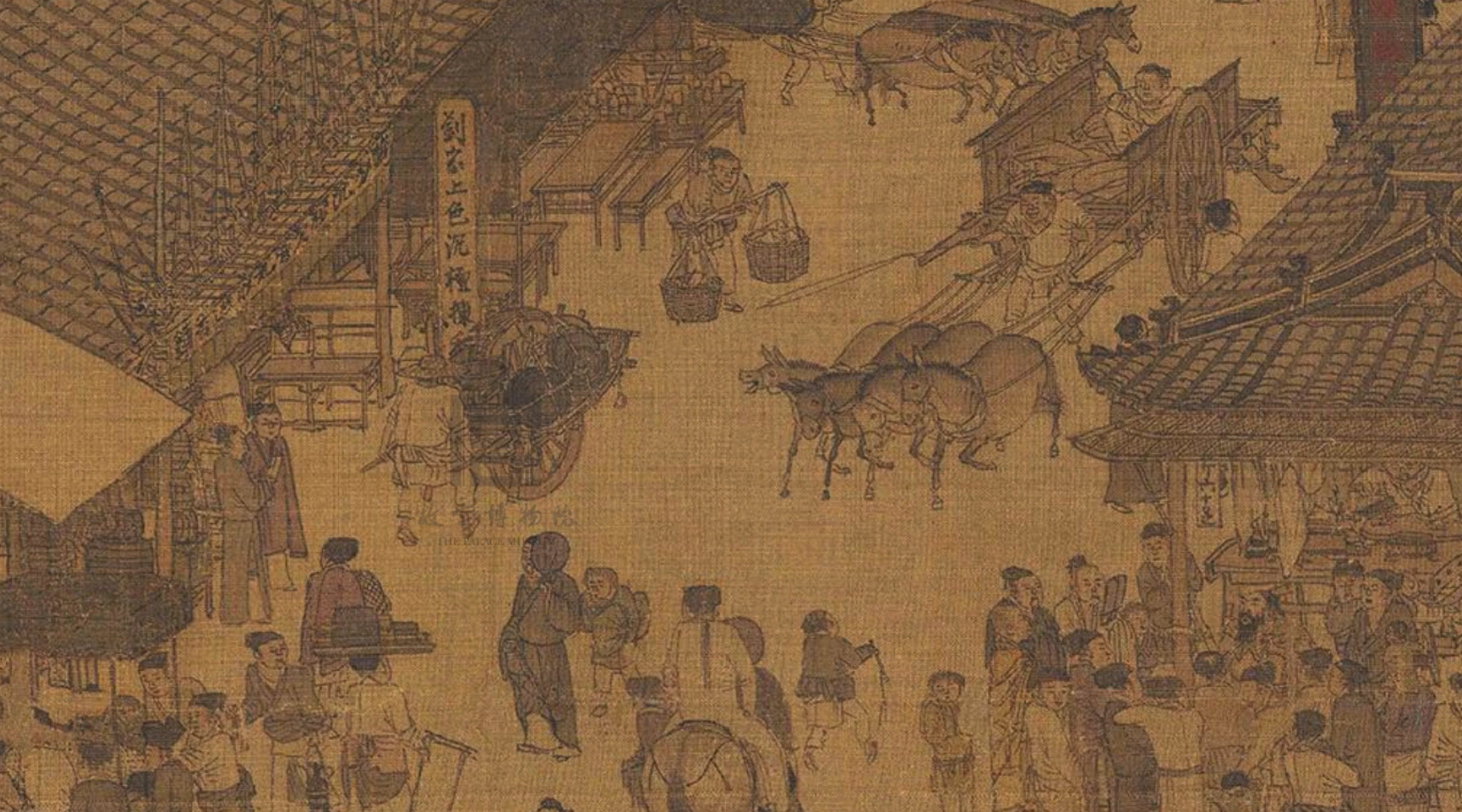 从城市到郊野,形形色色的人物数不胜数,正搬演着自己故事,眼中苦乐各有情:赶驴送炭的、打造车子、刀具的、抬轿的、赶车的、卖东西揽客的、行乞的、高楼宴飨的、买卖吆喝的、官宦行列过街的;也有争吵斗殴的一幕,有人劝架、有人发怒、也有人在笑观;还有问路的外乡人,等待就医、算命的,也有沉沉入眠的……尽管是人生的日常,在“上河”的时空里彼呼此应,无不维妙维肖,仿佛音声可闻,神态淋漓尽致。