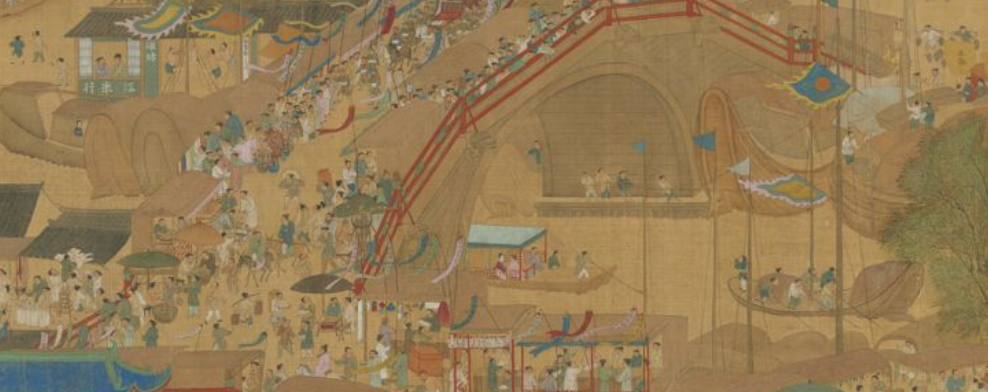 张择端在5.28米长卷中,取汴京城东城门里外连到虹桥一带作为主要时空舞台。画轴从汴京郊野展开,沿着水道和水滨陆地并行进入汴京代表景点虹桥集市,在这里展开了画的大主题,接着来到东城门,水路、陆路在此分道扬镳进城,水路稍偏北,陆路动线进入城中闹区。画卷一路展开九百年前世上最大都市、人口超百万的汴京清明时节的繁盛景况。