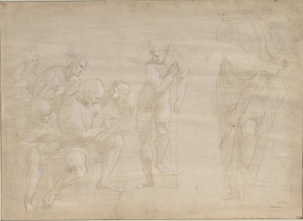 此后,他受命为梵蒂冈宫的四间厅室(合称“拉斐尔房间”)绘制湿壁画,其中以签字厅的《雅典学派》(School of Athens)最为著名。本次展出的“毕达哥拉斯与弟子”草图(约1509–1510年)来自维也纳阿尔贝蒂娜博物馆,是该壁画罕见的构图底稿。同场展出的还有另外三间厅室壁画的底稿,并辅以大型数码影片,全方位还原四个房间壁画完成后的整体样貌。