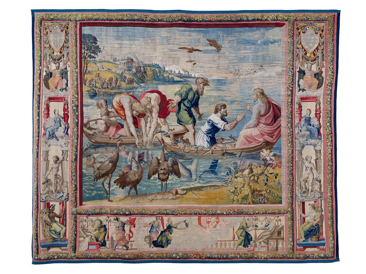 拉斐尔讲故事的高超技巧,在《撒网捕鱼的神迹》(The Miraculous Draught of Fishes)这件挂毯中展露无遗。大都会博物馆附加说明:其构图“将漫长的叙事段落融于同一幅画中,随着情节展开而呈现;他在晚期作品中多次运用这一手法,包括他的绝笔之作——祭坛画《基督变容图》(Transfiguration,又名基督显圣容)”。拉斐尔辞世后,其遗体停放于画室时,此画就悬挂在他头顶上方。